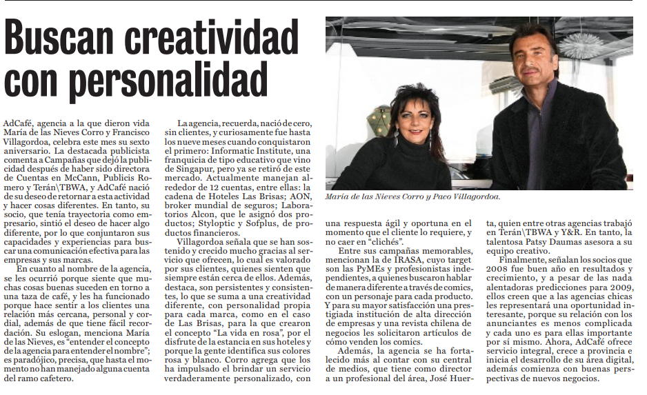 Buscan creatividad con personalidad Published on: enero 1, 2009 Published in: Presencia en Medios Cargando… ¿Tarda demasiado? Recargar el documento| Abrir en una nueva pestaña Post navigation Previous Article Previous Article Ad Café con Campaña de las Brisas Next Article Next Article Cumple 1 año Ad Café También te puede interesar BMA TV – La nueva ley de prácticas publicitarias Presencia en Medios Nuevas tendencias del marketing digital Presencia en Medios Leave a comment Cancelar la respuestaSave my name, email, and website in this browser for the next time I comment. What is the sum of 2 and 7? (Required) Leave the field below empty! Security: Confirm: